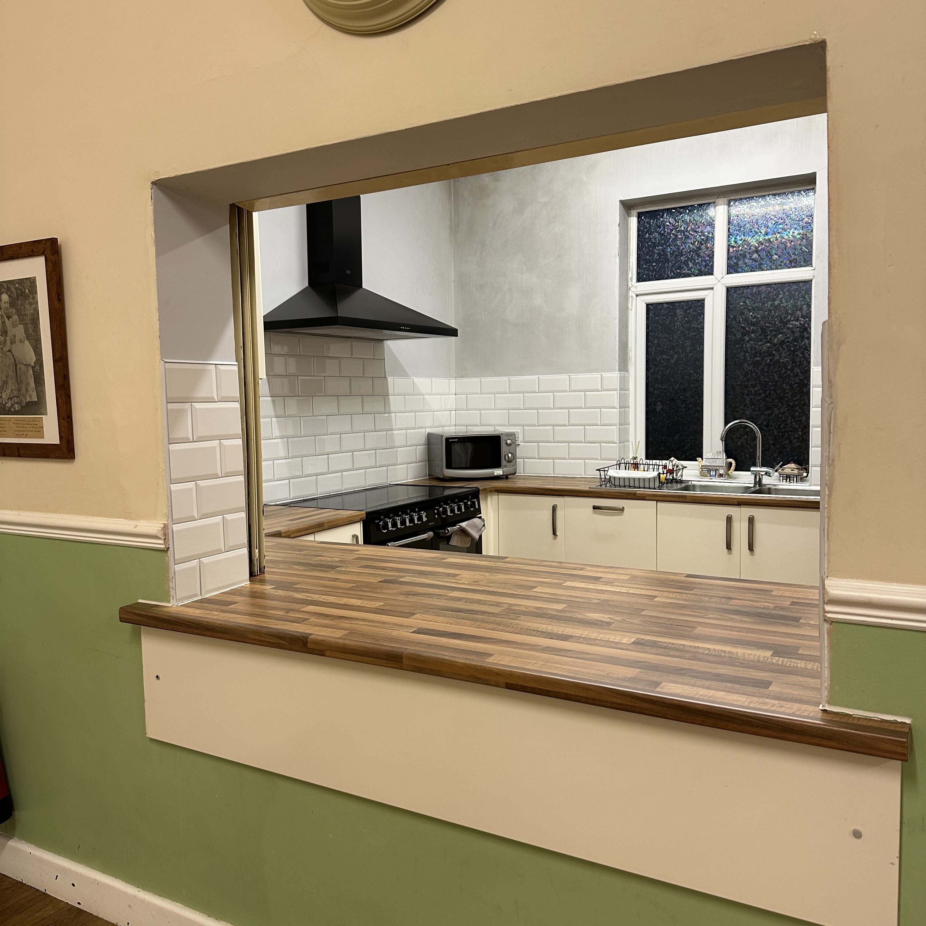 We have a well-equipped modern kitchen with a double range cooker and electric hob. There is also a fridge-freezer, dishwasher and microwave. The kitchen has a large serving hatch through to the hall.
